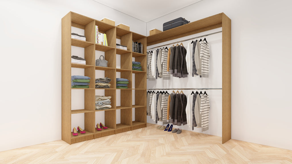 All wardrobes are customisable. If you require additional shelves, drawers, hangers or dividers you can add them via the dropdown menu options.