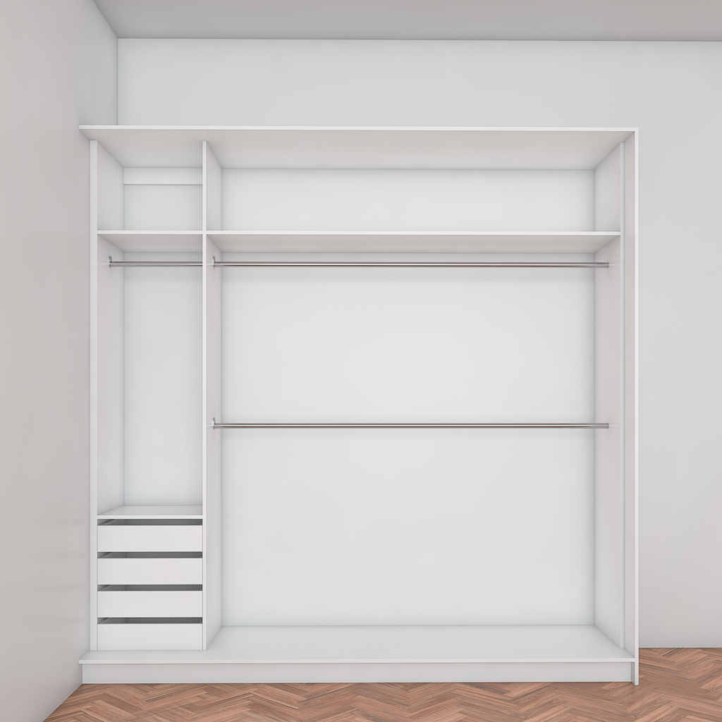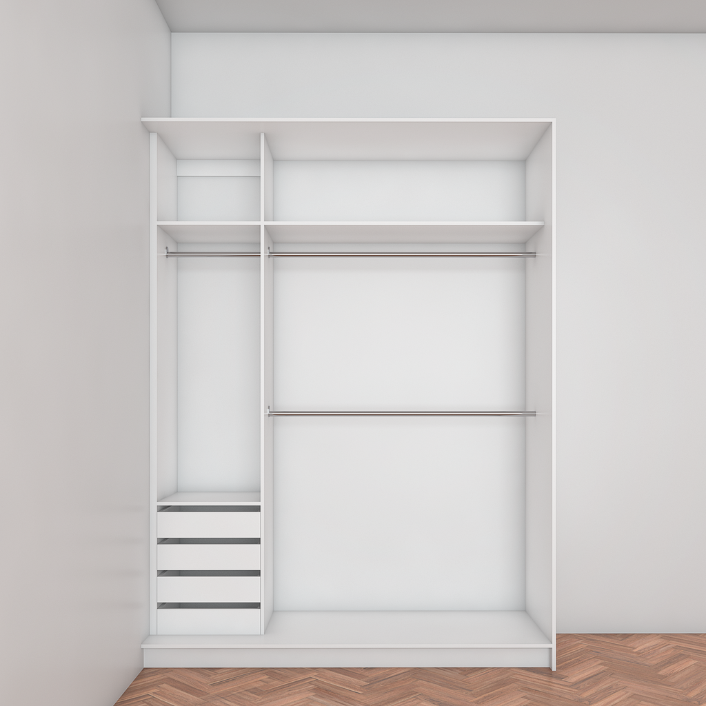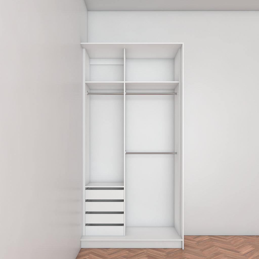 All wardrobes are customisable. If you require additional shelves, drawers, hangers or dividers you can add them via the dropdown menu options.